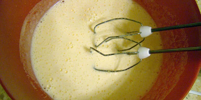 - Активно віночком збиваємо яйця з цукровим порошком. Всипаємо борошно, вливаємо молоко і замішуємо, поки маса не набуде однорідність.