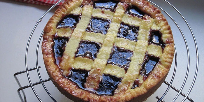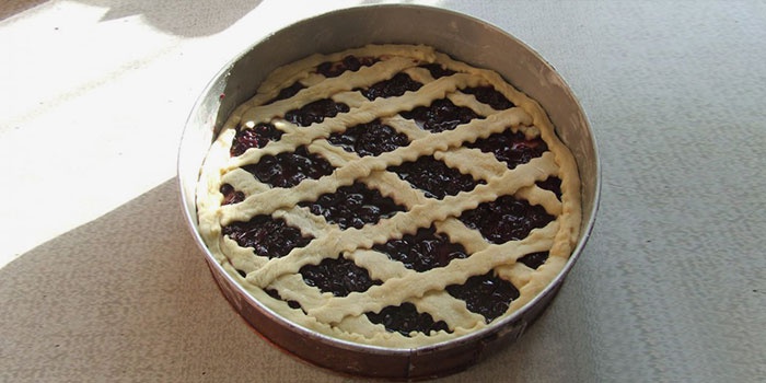 - Викладаємо варення. Тісто викладаємо зверху ґратами пирога.