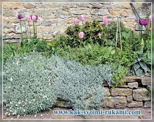 На брівці стінок, в щілинах і спеціально організованих нішах висаджують сланкі і ампельні багаторічники, такі як вербейник монетчатий, барвінок малий, глуха кропива зеленчуковая, будра плющевидная або пахизандра верхівкова. Дуже ефектні повзучі флокси шилоподібний, Дугласа, зірчастий, дернистий, що утворюють щільні дернинки. Доповнюють картину сріблясті плями чистеца шерстистого, ясколок Біберштейна і повстяної, глухої кропиви крапчастої, кольорові куртини низьких дзвіночків, живучки повзучої, тим’яну, обриет, очитків.