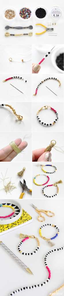 Дуже простий браслет з бісеру, який прикрашений симпатичною пензликом з ниток муліне. Завдяки такому цікавому додатком він виглядає свіжо і оригінально.