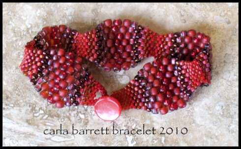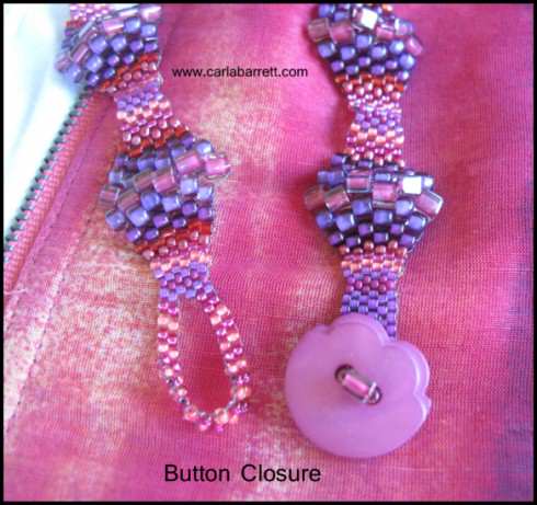 Буквально 5-6 рядів з дрібного бісеру, і можна знову йти на збільшення розміру матеріалу. І так до тих пір, поки сплетеного браслета не виявиться достатньо, щоб повністю охопити ваше зап’ястя. Після цього формуємо на одному кінці петлю, діаметром відповідну обраної гудзику, а на іншій безпосередньо саму гудзик.
