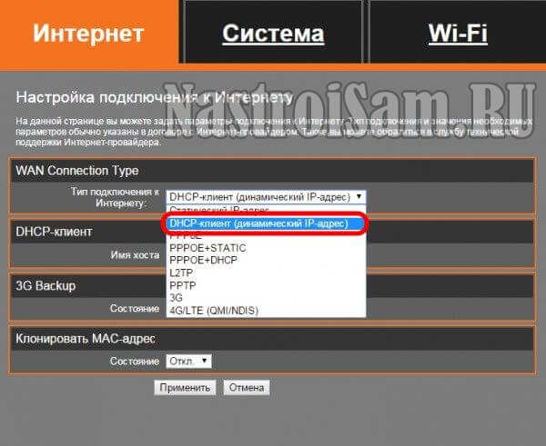 Якщо Ваш провайдер використовує тип підключення «Динамічний IP», то це ще простіше. Вибираємо в списку пункт «DHCP-клієнт»: