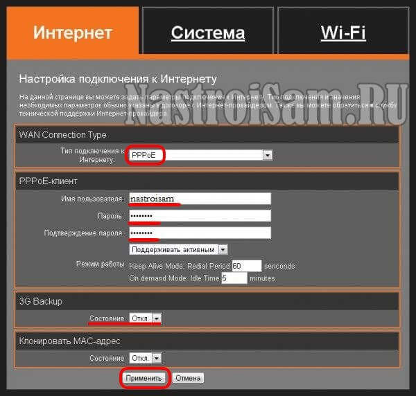 У переважної більшості провайдерів в Росії (Ростелеком, Будинок.ру, ТТК) використовується протокол PPPoE, який ми виставляємо в полі «Тип підключення». Нижче, у поля «Ім’я користувача», «Пароль» та «Підтвердження пароля» вводимо дані з картки, виданої Вам при укладенні договору. Функцію 3G Backup залишаємо відключеній. Натискаємо на кнопку «Застосувати».
