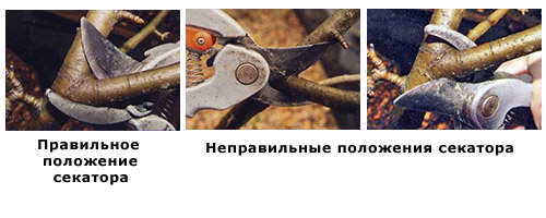 Опорне лезо повинно бути внизу, а робочий — звернене до гілки, від якої що-небудь відрізається. У правильному положенні опорне лезо буде деформувати тільки що видаляється частина гілки, а зріз буде гладким.