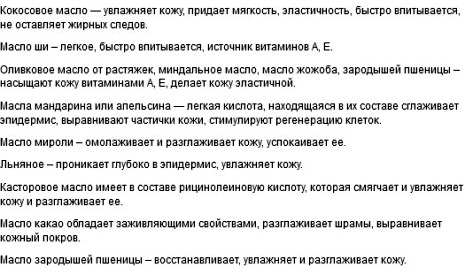 Від свіжих розтяжок допоможе позбутися масло лаванди, апельсина і неролі, а з застарілими боротися набагато складніше. На першому місці тут оливкова, також можна застосовувати зародків пшениці, ромашки, кунжутна, виноградних кісточок. Особливою ефективністю відрізняється масло какао, яке з легкістю проникає в глибокі шари епідермісу. Лляне – це відмінна профілактика стрий.