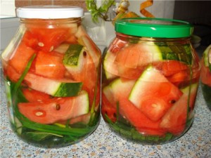 Як солити кавуни на зиму в банках? Зрозуміло, що в цьому випадку завжди використовується сіль, а також оцет, який забезпечить збереження продукту на довгі зимові місяці. Крім того, не кожна ягода підійде для маринування. Вибирати потрібно стиглі кавуни з хрусткою м’якоттю: зелені ягоди, так само як і перезрілі для цього не підійдуть. Рецептів приготування існує безліч. Крім класичних солоних арбузов можна закрити пряні з гірчинкою ягоди, які по достоїнству оцінить чоловіча половина сім’ї. Ось деякі з рецептів:
