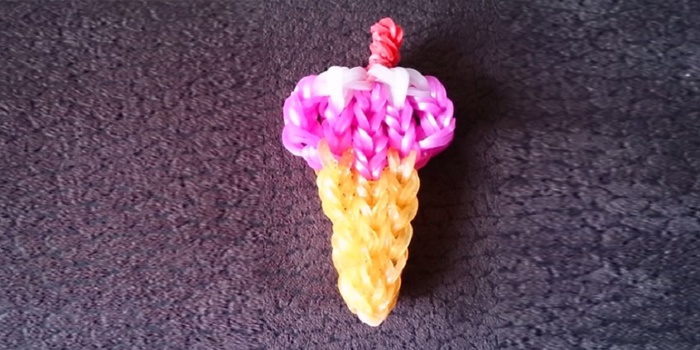 Морозиво з гумок – оригінальна виріб, який своїми руками зможуть створити всі шанувальники плетіння. Ця фігурка може стати яскравою підвіскою для мобільного телефону, брелоків для ключів або рюкзака. Якщо у вас немає верстата, то ви можете сплести морозиво з гумок на вилці. Для виготовлення вам можуть знадобитися райдужки основного відтінку і додаткового.