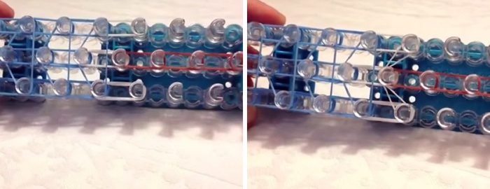 • Надягаємо контактні резиночки, скручуючи в кілька оборотів. Проплетаем всю фігурку з допомогою гачка. Робимо вгору петлю знімаємо. Розрівнюємо фігурку, злегка тягнемо у різні боки, щоб гумки в плетінні зайняли своє місце, і саморобка прийняла правильну форму.