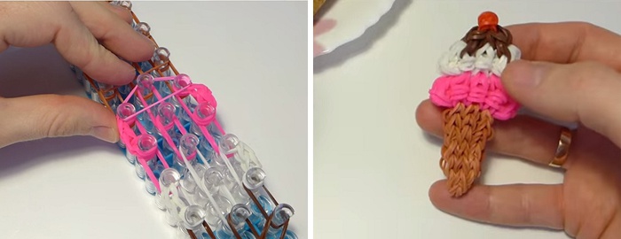 Новий вид рукоділля підкорює багатьох майстринь завдяки доступності матеріалів і простотою техніки виконання всіляких браслетів, брелоків, кулонів, фігурок тварин. Як зробити морозиво з гумок, вам підкажуть представлені нижче відео-уроки, майстер-класи. Спочатку ви освоїте схему виконання фігурки на верстаті, який представляє собою нерухому платформу з прозорими пластиковими кілочками. Наявність цього інструменту значно полегшує створення різноманітних поробок.