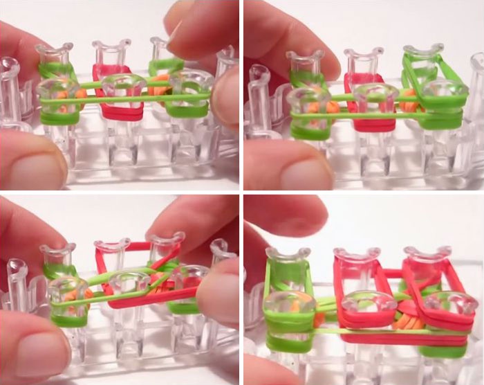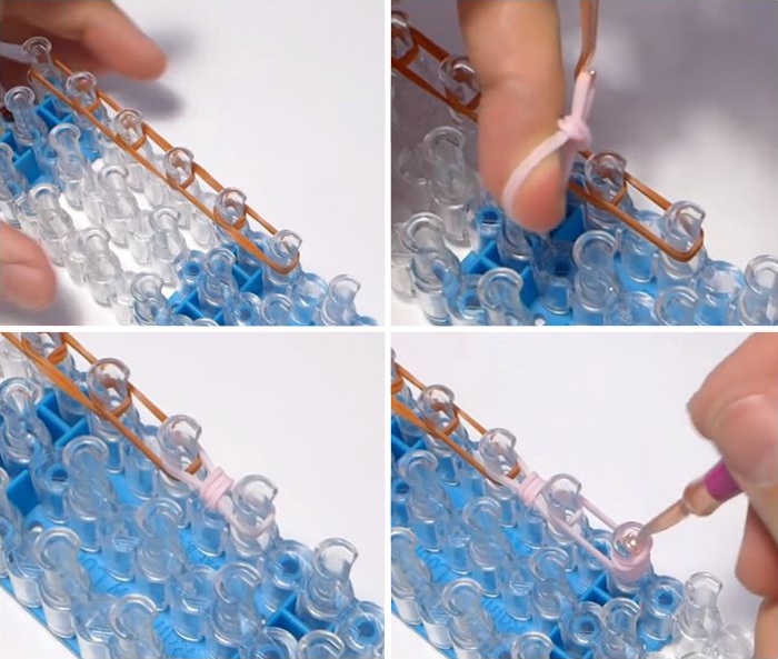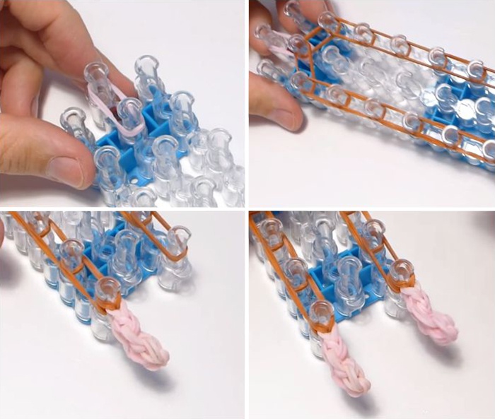 - Щоб сплести хвіст, надіньте Rainbow Loom, як на фото, а після – з кінця зніміть роботу:
