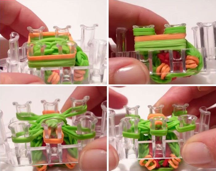- Накидаємо резиночку помаранчевого кольору для дзьобик, а поверх – rainbow loom зеленого кольору.