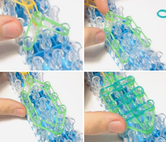 - Надягаємо горизонтальну резиночку і по дві штучки зелених елементів, з’єднуючи стовпчики попарно. Скидаємо нижні петлі в центр. Аналогічно створюємо 3 ряди.