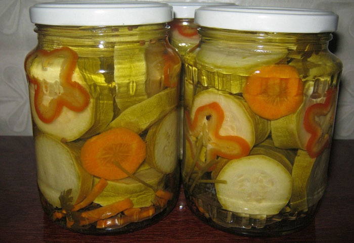 Перед приготуванням маринаду для кабачків, подумайте, який ви хочете отримати смак. Якщо солоний, то кількість солі повинно бути 7-8 десертних ложок, а цукру – 1 столова. Для любителів більш солодких кабачків, вміст солі в маринаді потрібно зменшити і покласти велику ложку цукру, чайну – прянощів, десертну – оцту. Пастеризація відбувається при 85 градусах. Для банок 1,5 л – 15 хвилин, для дволітрових – 20 хвилин.