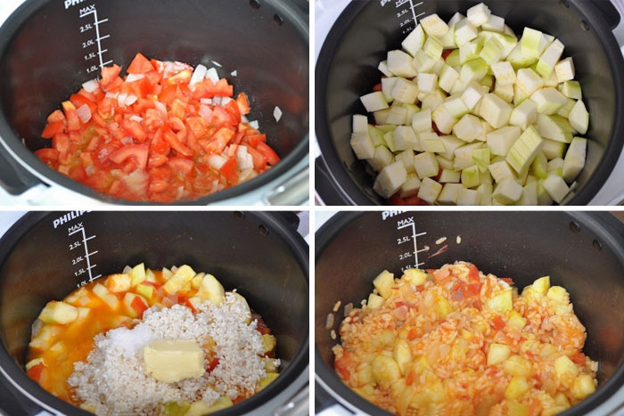 - Рис заздалегідь відварити, помістити до решти продуктів. Укласти все в чашу мультиварки, включити режим «Гасіння» при відкритій кришці. Під кінець готування додати пропущений через прес часник. Всі укласти в банки і закатати.