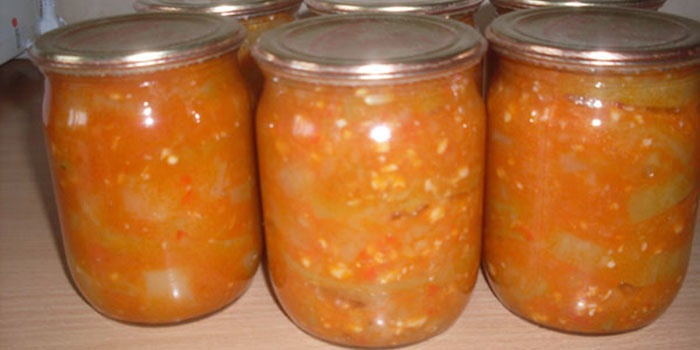 - По закінченні викласти салат на основі кабачків в готові стерилізовані банки, замовити, укутати ковдрою.