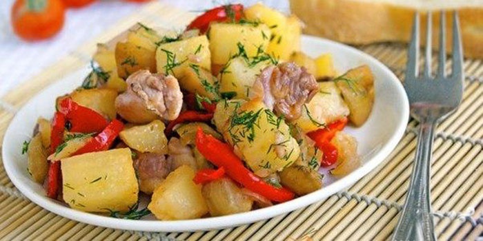 - Тим часом очистіть, наріжте кубиками картоплю. Додайте до попередніх інгредієнтів. Залийте невеликою кількістю води, накрийте кришкою, щоб страва трошки потушилось (хвилин 15).