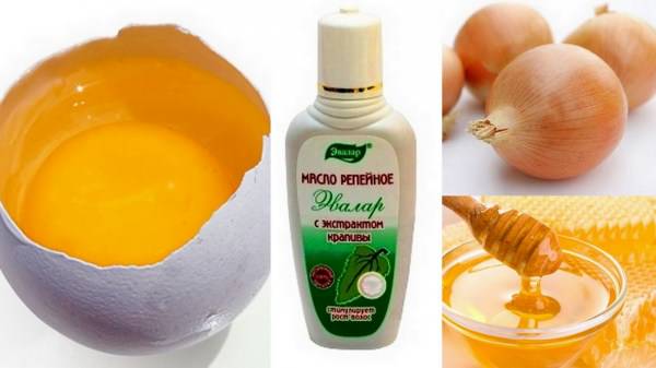 - для приготування ефективного засобу необхідно змішати в пропорції 1:3:3:3 коньяк, яєчні жовтки, відвар з коренів лопуха і цибульний сік. Всі інгредієнти слід перемішати і збити за допомогою міксера до однорідної кашки. Цей склад необхідно втерти у волосся і шкіру голови, потім замотати рушником або пакетом і потримати 2 години, а потім змити. Рекомендується повторювати таку процедуру щотижня;