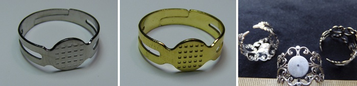 Металеві кільця з майданчиком або рамкою для кабошона мають масу різновидів. Ви можете придбати основи з золотим, платиновим, мідним покриттям. Такий виріб ви можете прикрашати на свій розсуд. Фурнітура для кілець має свою особливість: всі металеві дуги відкриті – це зроблено для того, щоб клієнт сам міг зігнути або розігнути аксесуар за розміром пальця. Не забудьте, що для регулювання розміру вам знадобляться плоскогубці.