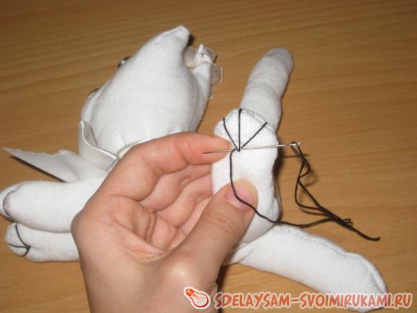 4. Зшиваємо тулуб і залишаємо з одного боку отвір. Через недошита отвір вивертаємо носок з вивороту, заповнюємо тулуб кошеня підготовленим наповнювачем і зшиваємо залишений отвір невидимим швом.