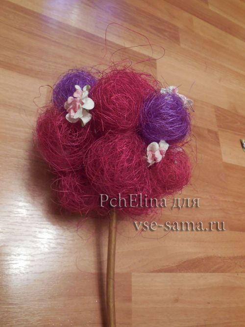 5. Прикрашаємо вільний простір і сизалю кулі квітами для скрапбукінгу, не забуваємо нанести клей з термопістолети.