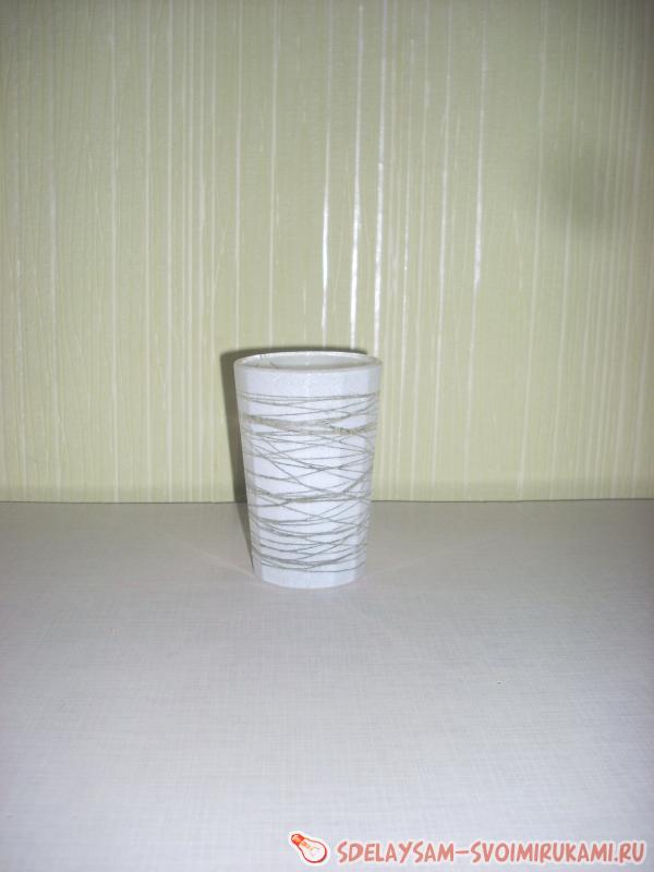 2. Обмотуємо склянку тонкими швейними нитками. Чим більше буде ниток, тим менш прозорим буде наш свічник. Кінець нитки можна закріпити за допомогою двостороннього скотча.