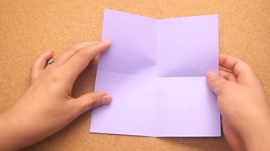 Розгорніть лист, а потім знову складіть його, але вже вертикально, зразок книги. Знову пропрасуйте лінію згину. Потім розправте аркуш паперу. У вас вийде квадрат, посередині якого будуть проходити 2 схрещені під прямим кутом лінії, що розділяють його на 4 рівних сектора.