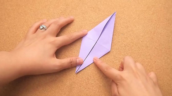 Права складка згинається до лівої, зразок книжкової сторінки. Ту ж маніпуляцію слід повторити для другої сторони майбутнього журавлика. У вас вийдуть голова і хвіст птаха, розташовані між крилами. Вони підняті вгору, паралельні один одному.