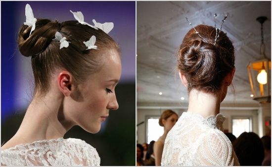 Волосся, зібрані в елегантний пучок – класика весільного стилю. Сьогодні популярне укладання трохи модернізувалася. Стилісти пропонують нареченим вільні пучки з складними елементами. У моді укладання з вплетеними косами, складними переплетеннями і гарним декором.