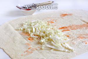 Лаваш змастити трохи гостро-солодким соусом чилі і, ближче до лівого краю, викласти шар пекінської капусти.