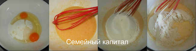 Борошно просіяти і змішати з крохмалем. Додати розпушувач і поступово додати в збиту суміш. Замість розпушувача можна використовувати харчову соду одну чайну ложку. Соду потрібно погасити оцтом або лимонним соком.