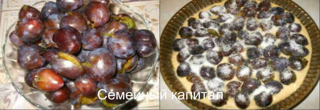 Сливи вимити. Видалити кісточку. Вийняти пиріг з духовки і викласти сливи. Сливи можна укладати по різному: розрізом вгору або вниз. Мені більше подобається викладати сливи зрізом вгору.