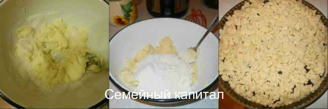 Натерти тісто на крупній тертці або просто руками розім’яти, щоб вийшла крихта. Посипати зверху пиріг.