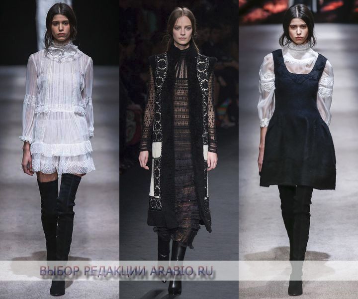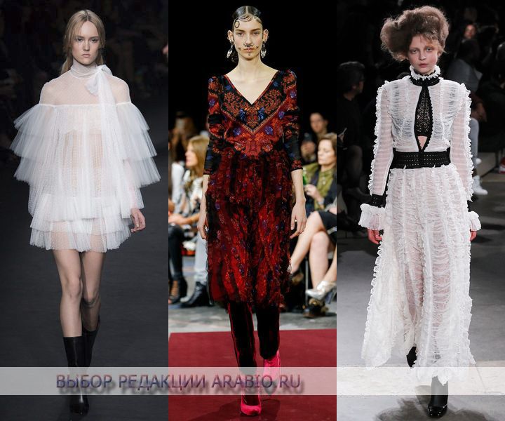 Манірні криноліни, романтичні рюші і жабо, кокетливі волани і шовкові банти, високі ажурні і в’язані «шкільні» комірці, об’ємні рукави – всі ці деталі відбивають Вікторіанський стиль. Тут і напівпрозорі блузки з ручною вишивкою і об’ємними рукавами та сукні в підлогу з каскадної спідницею і спідниці з оборками, доповнені блузами з мереживними манжетами, і пальто «летюча миша», доповнена розкішним мереживом або хутром – справжній дух Вікторіанської епохи. Шикарно виглядають і сукні в Вікторіанському стилі – найдовші у підлогу або укорочені, приталені з пишними спідницями або прямого крою, доповненими контрастною вишивкою або шифоновими оборками, з сексуальним напівпрозорим верхи і кокетливими мереживними комірцями-стійкою. Виглядають просто чудово! Окремої уваги заслуговують блузки, виконані з прозорого шифону, з доповненням з аплікацій з крученого мережива, кокетливими шовковими бантами і оборками. Такі блузки відмінно підкреслять і додадуть пікантності, як звичайним штанів-дудочкам, так і облягає спідниці-олівець або спідниці з пишним подолом.