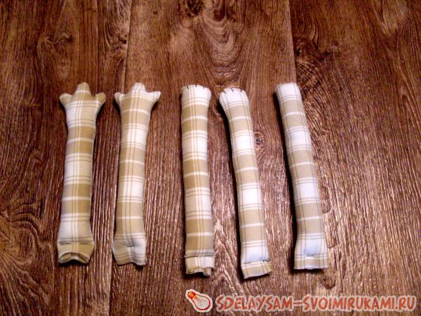 Деталі лап і хвоста слід скласти попарно обличчям всередину і зшити по периметру на відстані 1 см від зрізів, на заокругленнях підрізати припуски шва до 4 мм (це полегшить вивертання деталей).