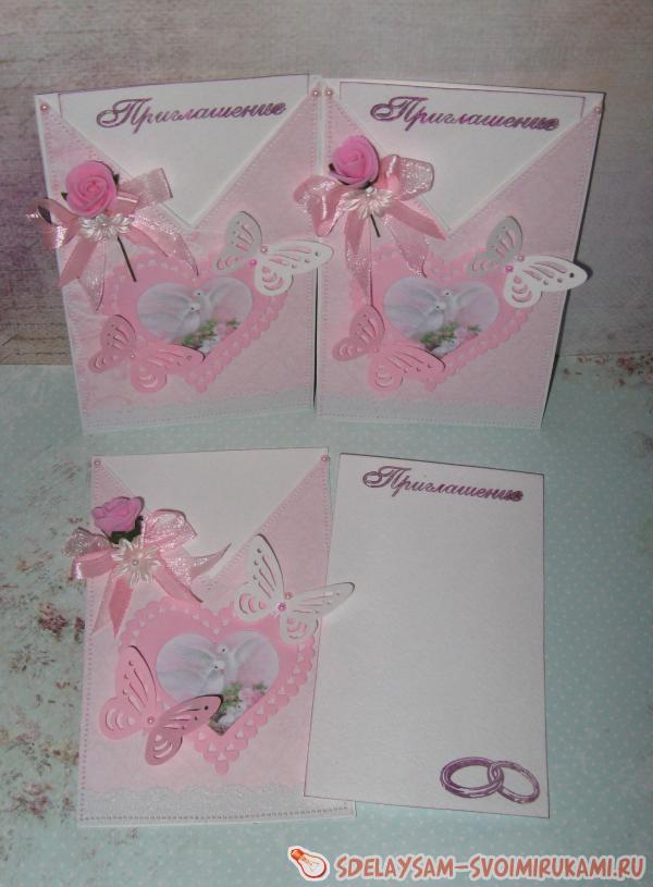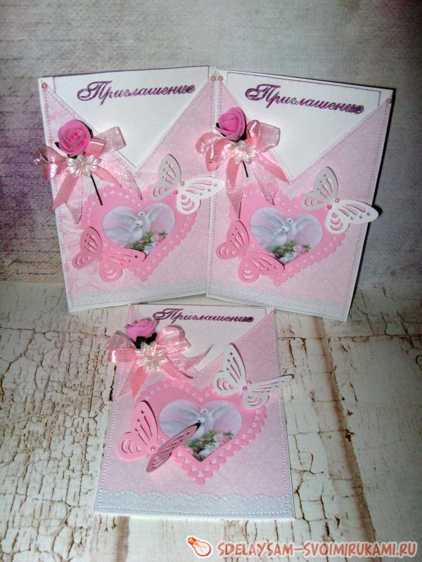 Клеїмо скрап заготовки до основи і пришиваємо выкот на машинці. Потім складаємо конверт і пришиваємо разом боки і низ кожного запрошення. Робимо вирубку метеликів з однієї рожевої з паперу і по одній акварельного. Зав’язуємо три бантика з органзи і три бантика з атласу. Краї бантиків прижигаем. Клеїмо декор, як на фотографіях. Отримуємо ось такі ніжні весільні конвертики-запрошення. Спасибі за увагу!
