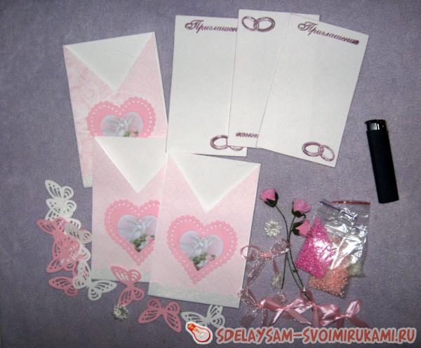 Прямо зараз і познайомимося з цікавим процесом по виготовленню весільних запрошень конвертиків в рожевій гамі. Вони виходять дуже ніжні і оригінальні. Отже, для майстер класу беремо: