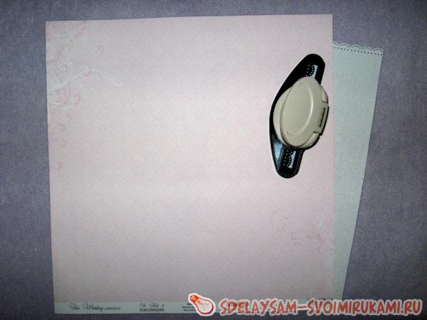 Для передньої частини запрошень з скрап-паперу вирізаємо три фігурні заготовки. Внизу клеїмо з перламутровою смужці, які робимо мереживними дироколом.