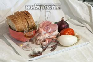 Аджика суха 1 щіпкаБаклажани білі 1 шт.Батон 6 шт.Коньяк 50 млЦибуля фіолетовий 1 шт.Цибуля-порей 1 шт.Олія соняшникова рафінована 3 ст. л.Помідори 1 шт.Свинина м’якоть на кістки 600 гСіль 1 щіпка