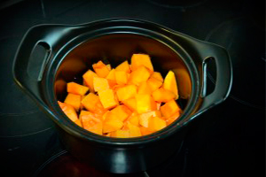 Поріжте м’якоть гарбуза невеликими кубиками. Укладіть овоч в каструлю, налийте трохи води і тушкуйте до готовності.