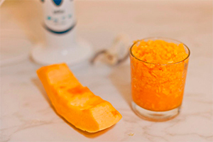 Очищену гарбуз наріжте довільними шматочками і подрібніть блендером. Якщо ви хочете, щоб смак гарбуза був більш вираженим, тоді натріть її на тертці.
