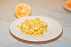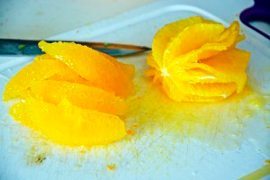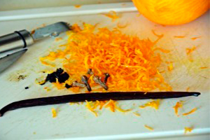 Поки вариться сироп, з апельсинів зніміть верхню жовту частину, потім очистіть їх від решти білої цедри, виріжте м’якоть і наріжте її кубиками. Дістаньте насіння з ванілі.