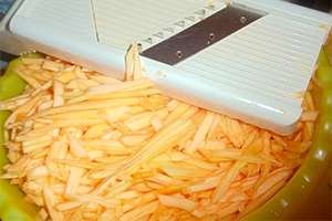 З яблук видаліть серцевину і наріжте їх пластинками або кубиками. Потім розітріть сир з цукром, додайте до нього родзинки, яблука і гарненько перемішайте.