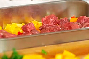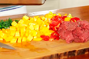 Очистіть від шкірки і насіння гарбуз, видаліть серцевину з перців. Потім овочі і м’ясо наріжте кубиками, подрібніть часник і поріжте зелень.