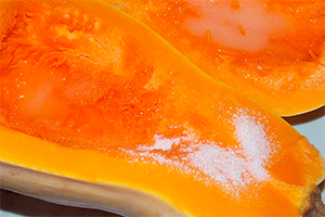 Гарбуз розрізати навпіл, приберіть з неї насіння і посипте цукром.