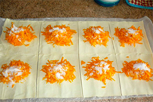 Дочекайтеся поки розморозиться тісто, потім розріжте його на квадрати. Очистіть і натріть гарбуз. Потім розкладіть її по квадратах і зверху посипте цукром. Защипайте краю тесту, формуючи пиріжки. Перекладіть пиріжки на застелений пергаментом деко і кілька разів проколіть кожен з них зубочисткою. Це необхідно для того, щоб міг вийти пар з начинки і пиріжки не розкрилися.