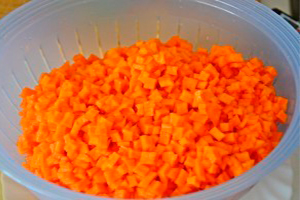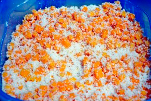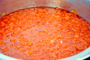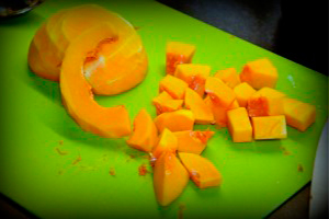 Очищену м’якоть гарбуза наріжте на однакові маленькі кубики. Перемішайте їх з цукром і залишіть годин на сім (можна на ніч).