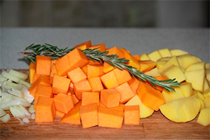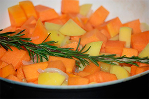 Очищені овочі наріжте кубиками. Викладіть їх і гілочку розмарину в сотейник, додайте пару ложок рослинного масла і трохи бульйону. Сотейник покладіть на вогонь і тушкуйте овочі, поки вони не стануть м’якими.