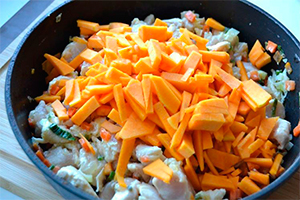 Гарбуз добре вимийте, а потім зріжте її верхівку і обережно дістаньте насіння. За допомогою ножа або ложки вийміть з овоча частину м’якоті. Після цього цибулю порей нарізати кільцями, моркву – дрібними кубиками, філе невеликими шматочками, витягнуту м’якоть гарбуза – тонкими пластинками, помідори розріжте навпіл.