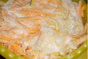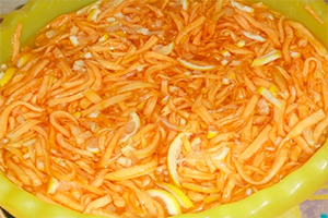 Очищену гарбуз і лимони нашаткуйте тонкою соломкою. Покладіть лимон і гарбуз в одну ємність, засипте цукром, перемішайте і залиште години на два.