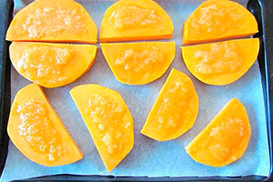 Гарбуз розрізати на порційні шматочки (їх товщина повинна бути близько сантиметра), а потім видаліть з них шкірку. Застеліть деко пергаментом, викладіть на нього скибочки гарбуза і полийте кожен з них медом. Скільки саме його брати, залежить від вашого смаку. Якщо ви любитель солодкого, меду можна додати більше, гірше від цього гарбуз не стане.